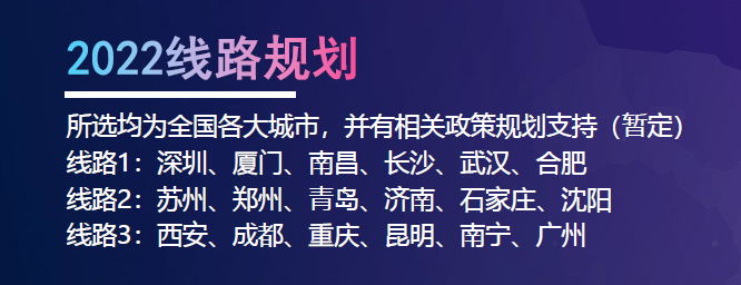 2022年第四屆交通安全萬里行以“數字賦能 智慧出行 打造交通安全新體系”為主題,分別是3-4月灣區行和7-8月份萬里行兩條線路,計劃城市:深圳、 萍鄉 、廣州、 成都 、杭州、 武漢、南京、濟南 、天津、 北京、 候選:珠海、東莞、惠州、佛山。