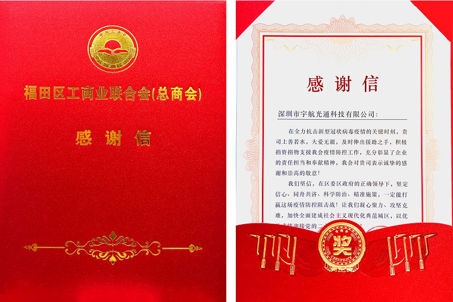 近期,宇航收到由深圳市福田區頒發的榮譽證書和感謝信: