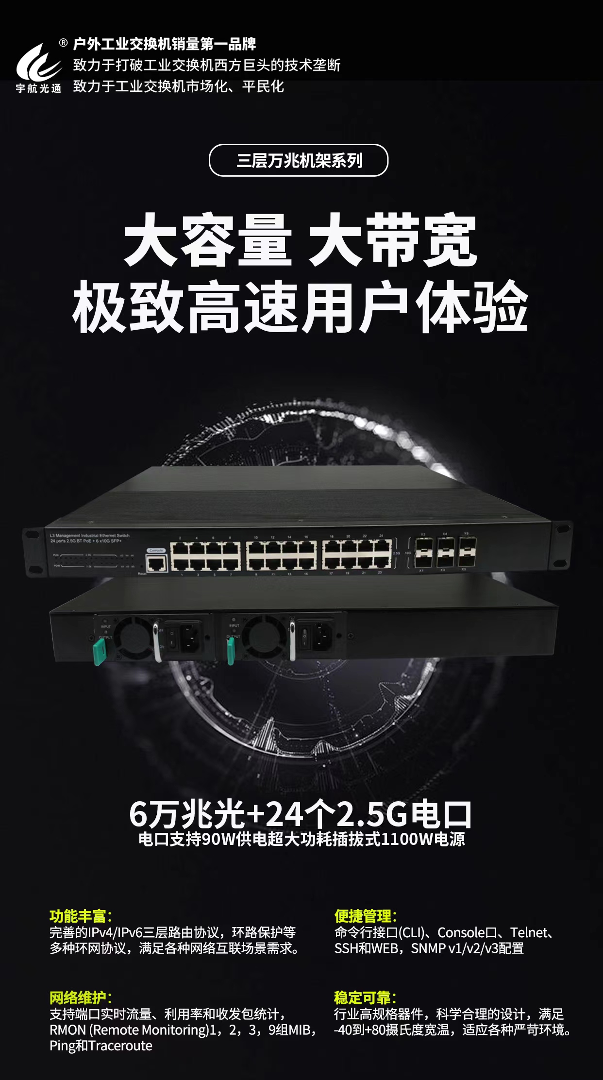 宇航6萬兆+24個2.5G電口工業交換機單個端口BT-90W-POE供電,雙電源1100W超大功率,高帶寬、穩定可靠、功能豐富、電源冗余、網絡維護以及便捷管理等特點,為用戶提供了極致的高速體驗和可靠的網絡連接。它具有6個10G上行主干光口和24個2.5G電口,可以滿足大規模數據傳輸的需求。行業高規格器件和科學合理的設計,使其能夠適應各種嚴苛的環境,確保設備在各種條件下都能穩定運行。雙電源模塊,支持AC/DC多種供電方式。支持端口實時流量、利用率和收發包統計等網絡維護功能,更好地監控和管理網絡。