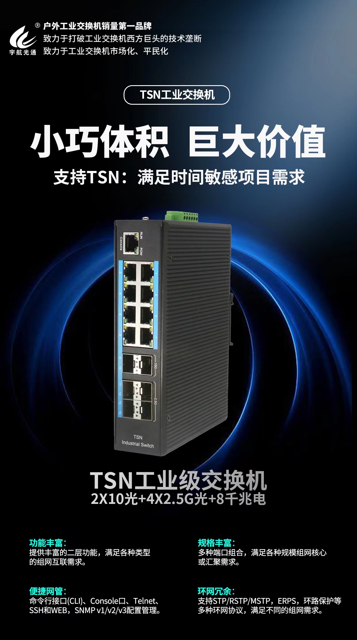 近期,宇航工業交換機推出了全國產工業交換機,引發了行業的廣泛關注與熱烈討論,各大媒體紛紛爭相報道這一重大消息。與此同時,宇航工業交換機還推出了多款新產品,這些產品各具特色,均以其卓越的性能、穩定的質量和出色的表現,成為了市場上的亮點。今天,將為大家詳細介紹這幾款新產品,讓我們一同領略宇航工業交換機的獨特魅力與卓越實力。