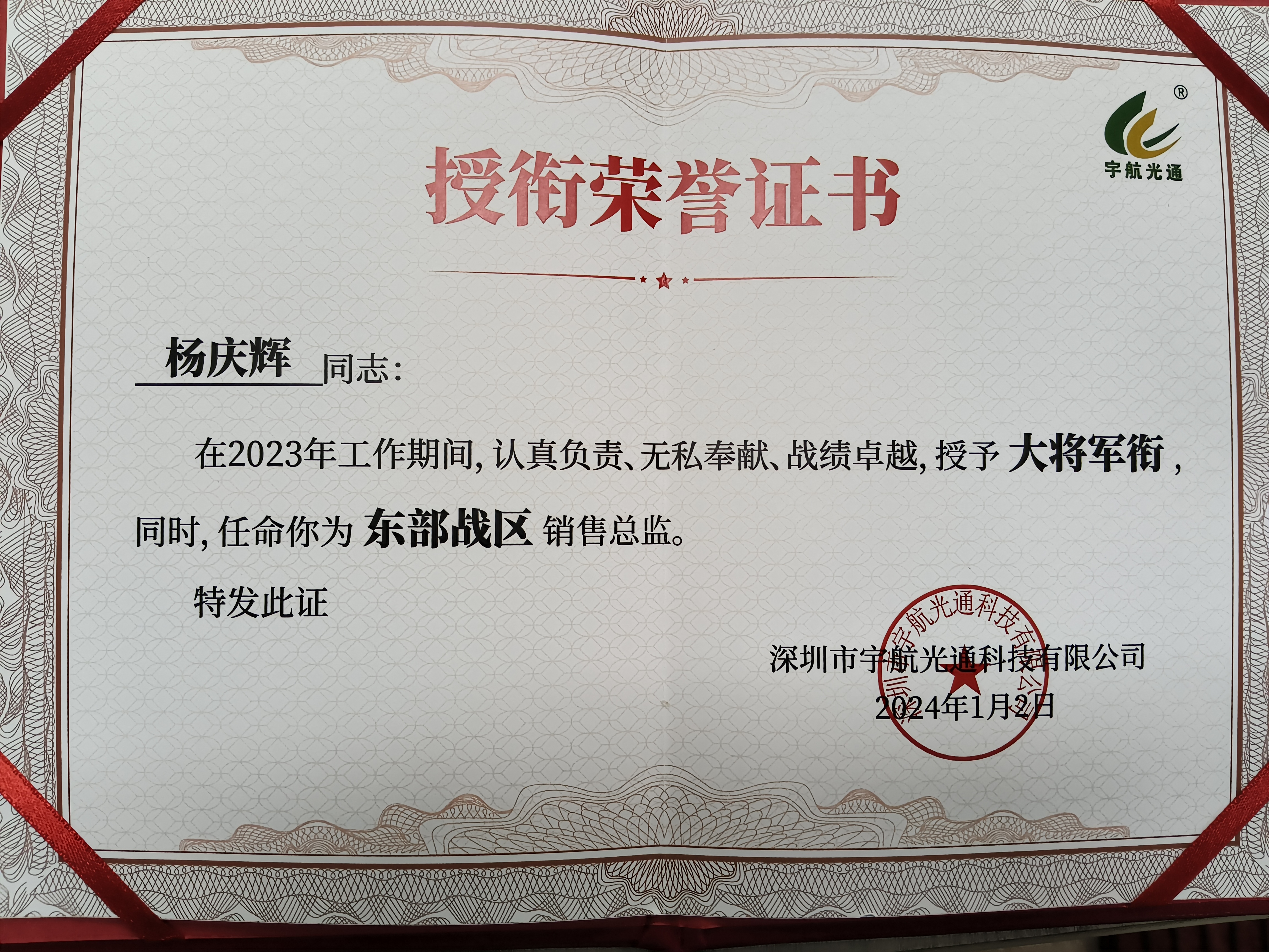 宇航工業交換機楊慶輝在2023年工作期間,在銷售工作中始終保持著高度的熱情和責任感,為公司帶來了顯著的銷售業績,授予“大將軍”銜,同時,任命為東部戰區銷售總監。