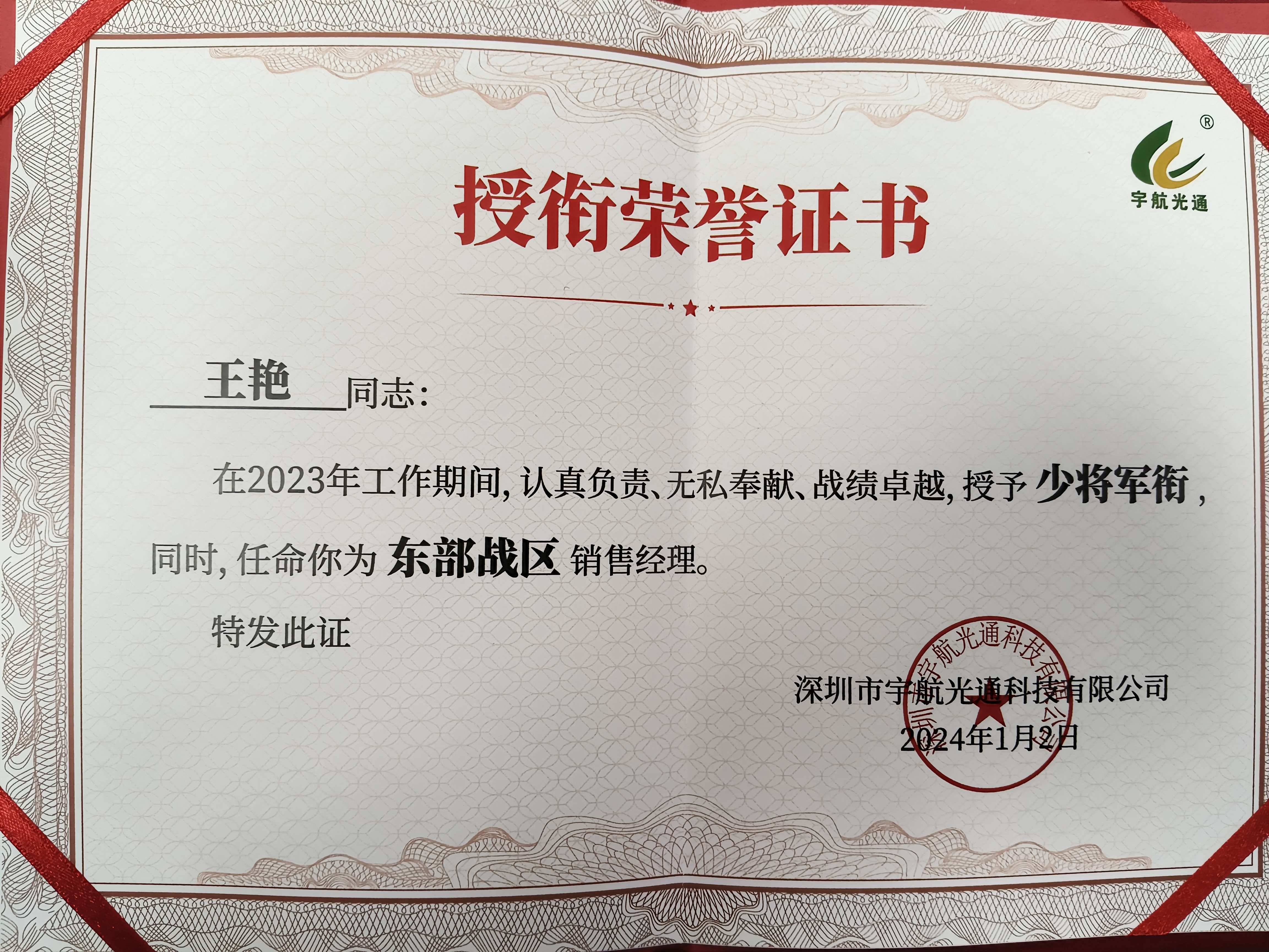 宇航工業交換機吳利香在2023年工作期間,認真負責、業績斐然,表現出色,授予“少將軍”銜,同時,任命為南部戰區銷售經理。