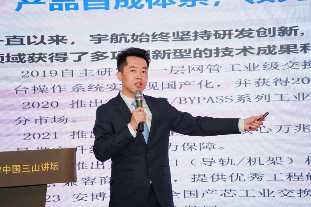 頒獎結束后,宇航工業交換機營銷副總張玉平在會上作了《宇航貫徹落實新質生產力發展推動工業交換機先進制造》主題分享,張總向大家分享了宇航作為全國產工業交換機發起單位所承擔的使命和責任,同時加強了發布全國產工業交換機產品的意義。