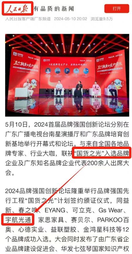 2024年5月10-11日,2024首屆品牌強國創新論壇,分別在廣東廣播電視臺南星演播廳和廣東品牌培育創新基地舉行開幕式和主題論壇,宇航工業交換機成功入選品牌強國先行工程“國貨之光”。