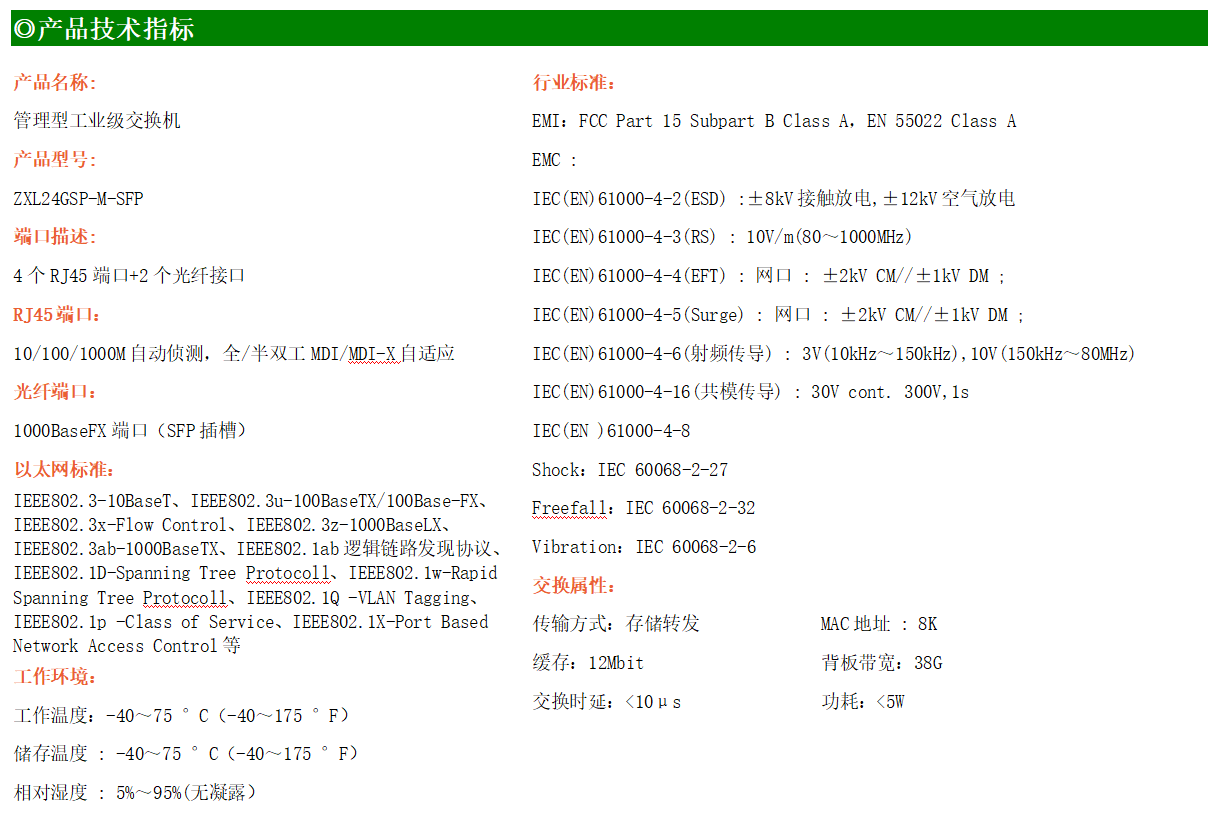 ZXL24GSP-M-SFP是網(wǎng)管型工業(yè)以太網(wǎng)POE交換機(jī),產(chǎn)品符合FCC、CE、RoHS標(biāo)準(zhǔn)。支持2個(gè)千兆光口和4個(gè)千兆電口;支持工業(yè)現(xiàn)場(chǎng)所需的以太網(wǎng)二層協(xié)議,保證通信網(wǎng)絡(luò)的穩(wěn)定性;該系列交換機(jī)采用低功耗、無(wú)風(fēng)扇設(shè)計(jì),確保無(wú)噪聲干擾,同時(shí)支持-40~75℃工作溫度和良好的EMC電磁兼容性能,保證在惡劣的工業(yè)環(huán)境中保持穩(wěn)定的工作,為工廠自動(dòng)化,智能交通,視頻監(jiān)控等工業(yè)應(yīng)用領(lǐng)域組建快速穩(wěn)定的網(wǎng)絡(luò)終端接入網(wǎng)絡(luò)提供安全可靠的解決方案。