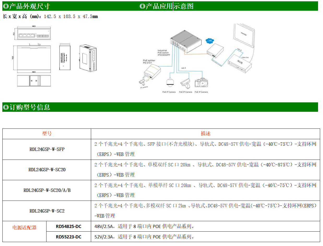 RDL24GSP-W-SFP系列WEB管理工業(yè)級以太網(wǎng)PoE交換機(jī),產(chǎn)品符合FCC、CE、ROHS標(biāo)準(zhǔn),支持工業(yè)現(xiàn)場所需的以太網(wǎng)二層協(xié)議,保證通信網(wǎng)絡(luò)的穩(wěn)定性。該系列交換機(jī)采用低功耗、無風(fēng)扇設(shè)計(jì),確保無噪聲干擾,同時(shí)支持-40~75℃工作溫度和良好的EMC電磁兼容性能,保證在惡劣的工業(yè)環(huán)境中保持穩(wěn)定的工作,為工廠自動化,智能交通,視頻監(jiān)控等工業(yè)應(yīng)用領(lǐng)域組建快速穩(wěn)定的網(wǎng)絡(luò)終端接入網(wǎng)絡(luò)提供安全可靠的解決方案。