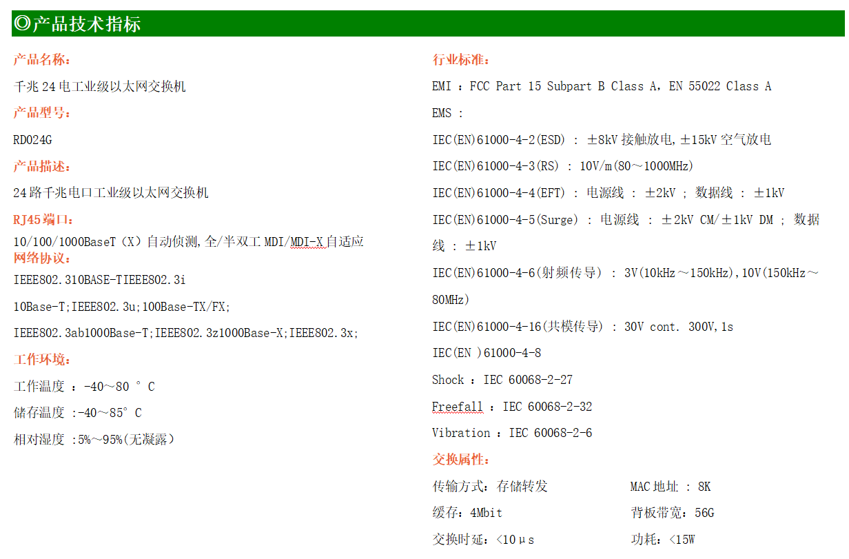 24路千兆電口工業(yè)級以太網(wǎng)交換機,支持24個10Base-T/100Base-T/1000Base-TX電口。產(chǎn)品符合FCC、CE、ROHS標準。RD024G交換機具有-40℃~80℃的工作溫度,具有超強的堅固度能適應(yīng)各種嚴苛環(huán)境,也可以非常方便的安置在空間緊湊的控制箱中。機架式安裝特性、寬溫操作及擁有IP40防護等級的外殼及LED指示燈,使RD224G-SFP成為一個即插即用的工業(yè)級設(shè)備,為用戶的以太網(wǎng)設(shè)備聯(lián)網(wǎng)提供可靠、便捷的解決方案。