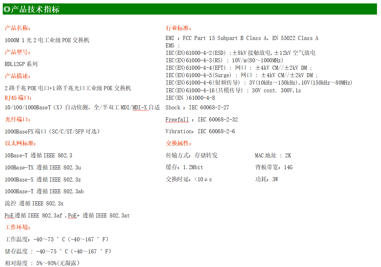 2路千兆POE電口+1路千兆FX光口工業級以太網POE交換機,支持2個10/100/1000Base-TX電口和1個1000Base-X光口。產品符合FCC、CE、ROHS標準。RDL12GP系列交換機具有-40℃~75℃的工作溫度,具有超強的堅固度能適應各種嚴苛環境,也可以非常方便的安置在空間緊湊的控制箱中。導軌的安裝特性、寬溫操作及擁有IP40防護等級的外殼及LED指示燈,使RDL12GP成為一個即插即用的工業級設備,為用戶的以太網設備聯網提供可靠、便捷的解決方案。