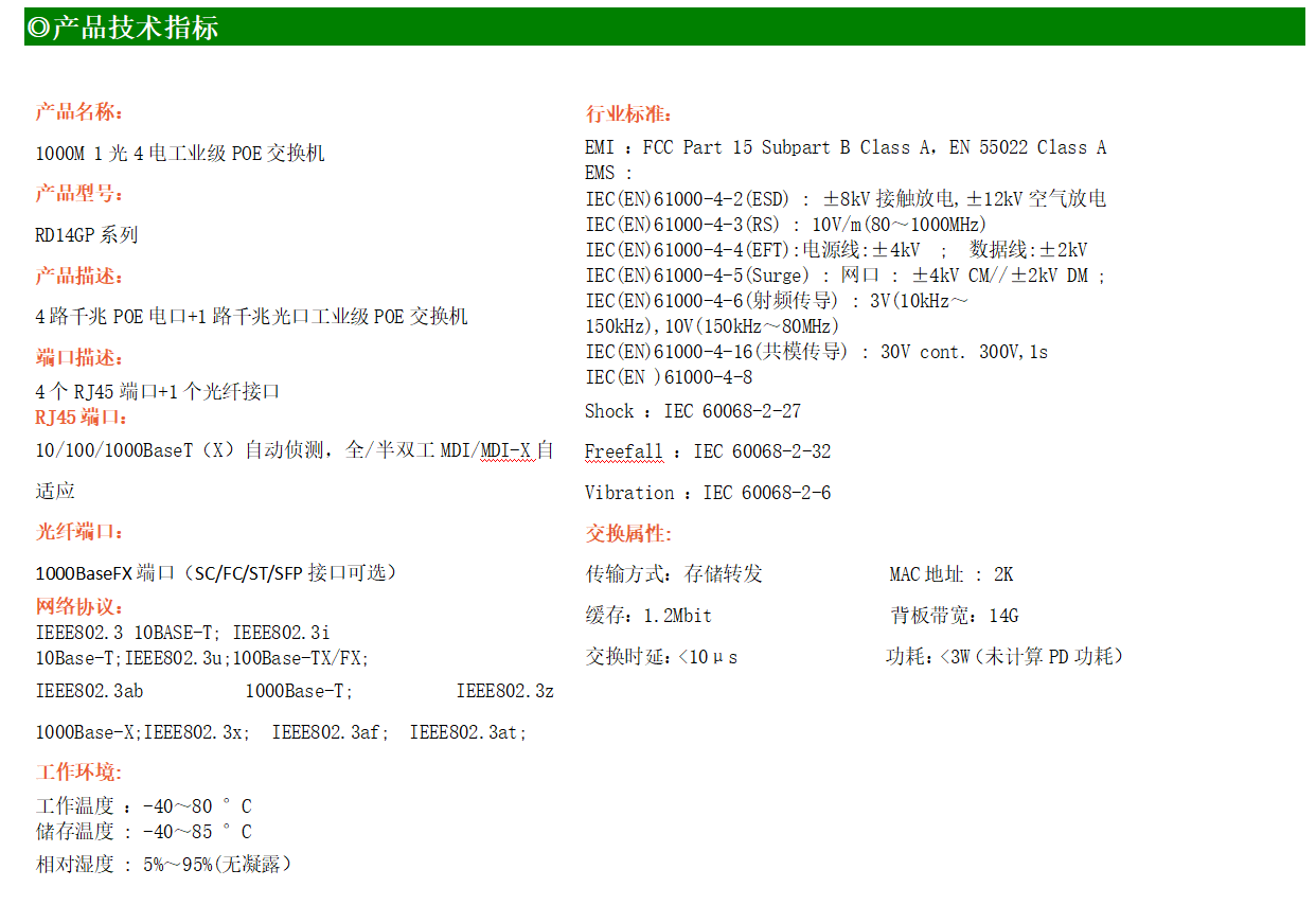 4路千兆POE電口+1路千兆FX光口工業(yè)級(jí)以太網(wǎng)POE交換機(jī),支持4個(gè)10/100/1000Base-TX電口和1個(gè)1000Base-X光口。產(chǎn)品符合FCC、CE、ROHS標(biāo)準(zhǔn)。RD14GP系列交換機(jī)具有-40℃~80℃的工作溫度,具有超強(qiáng)的堅(jiān)固度能適應(yīng)各種嚴(yán)苛環(huán)境,也可以非常方便的安置在空間緊湊的控制箱中。導(dǎo)軌的安裝特性、寬溫操作及擁有IP40防護(hù)等級(jí)的外殼及LED指示燈,使RD14GP成為一個(gè)即插即用的工業(yè)級(jí)設(shè)備,為用戶的以太網(wǎng)設(shè)備聯(lián)網(wǎng)提供可靠、便捷的解決方案。