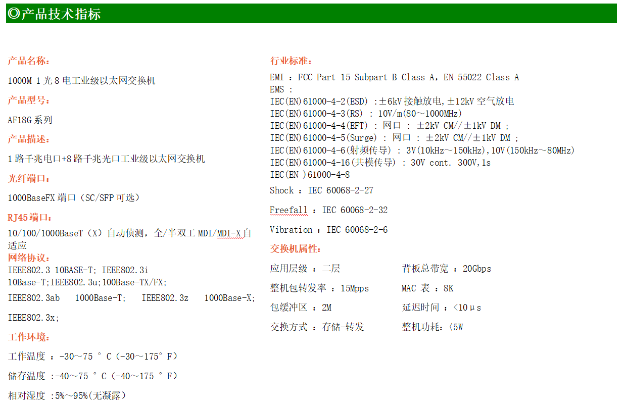 8路千兆電口+1路千兆FX光口工業級以太網交換機,支持8個100Base-T/1000Base-TX電口和1個1000Base-X光口。產品符合FCC、CE、ROHS標準。AF18G系列交換機具有-30℃~75℃的工作溫度,具有超強的堅固度能適應各種嚴苛環境,也可以非常方便的安置在空間緊湊的控制箱中。導軌的安裝特性、寬溫操作及擁有IP40防護等級的外殼及LED指示燈,使AF18G成為一個即插即用的工業級設備,為用戶的以太網設備聯網提供可靠、便捷的解決方案。