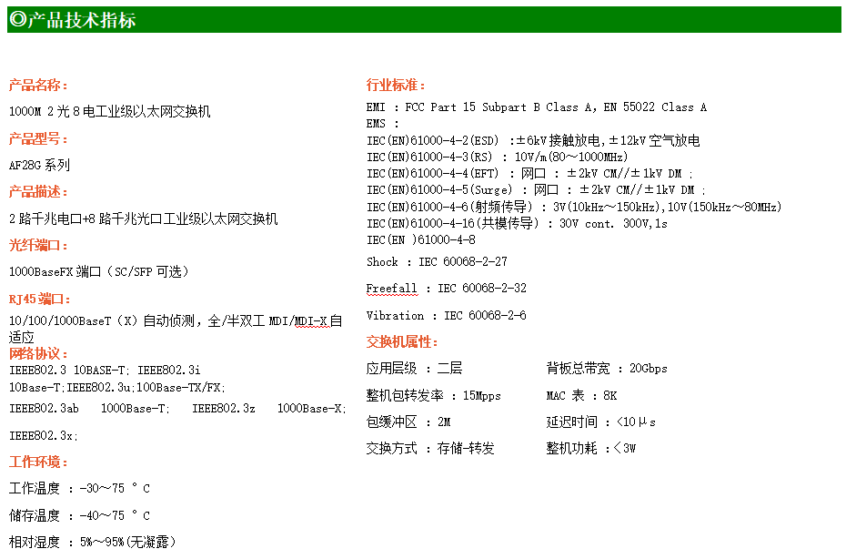 8路千兆電口+2路千兆FX光口工業(yè)級(jí)以太網(wǎng)交換機(jī),支持8個(gè)100Base-T/1000Base-TX電口和2個(gè)1000Base-X光口。產(chǎn)品符合FCC、CE、ROHS標(biāo)準(zhǔn)。AF28G系列交換機(jī)具有-30℃~75℃的工作溫度,具有超強(qiáng)的堅(jiān)固度能適應(yīng)各種嚴(yán)苛環(huán)境,也可以非常方便的安置在空間緊湊的控制箱中。導(dǎo)軌的安裝特性、寬溫操作及擁有IP40防護(hù)等級(jí)的外殼及LED指示燈,使AF28G成為一個(gè)即插即用的工業(yè)級(jí)設(shè)備,為用戶的以太網(wǎng)設(shè)備聯(lián)網(wǎng)提供可靠、便捷的解決方案。