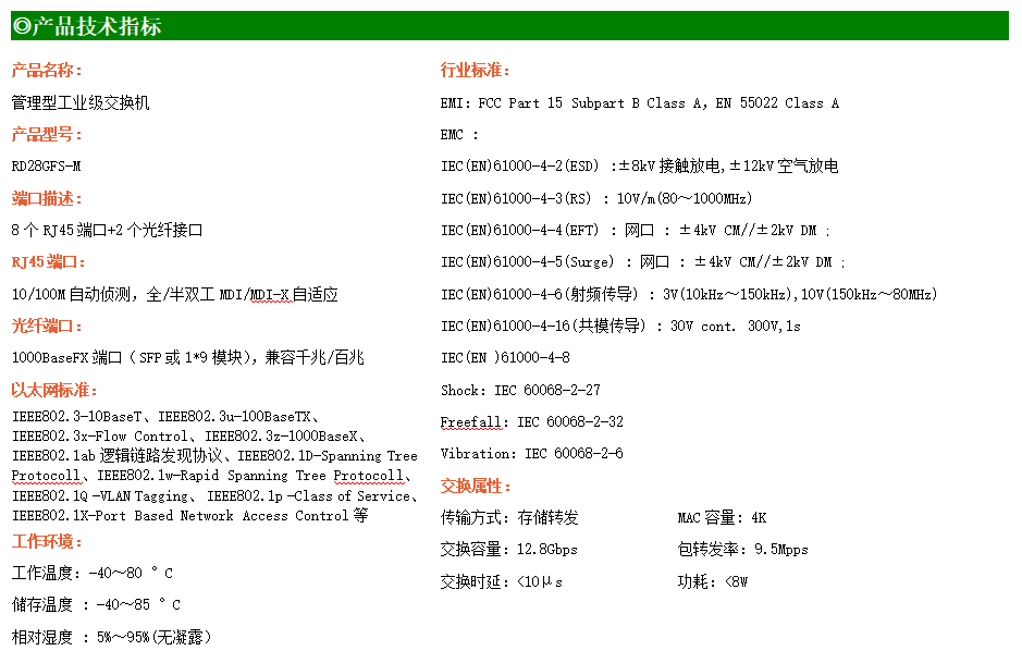 RD28GFS-M-SFP是網(wǎng)管型工業(yè)以太網(wǎng)交換機(jī),產(chǎn)品符合FCC、CE、RoHS標(biāo)準(zhǔn)。支持2個千兆光口和8個百兆電口;支持工業(yè)現(xiàn)場所需的以太網(wǎng)二層協(xié)議,保證通信網(wǎng)絡(luò)的穩(wěn)定性;該系列交換機(jī)采用低功耗、無風(fēng)扇設(shè)計,確保無噪聲干擾,同時支持-40~80℃工作溫度和良好的EMC電磁兼容性能,保證在惡劣的工業(yè)環(huán)境中保持穩(wěn)定的工作,為工廠自動化,智能交通,視頻監(jiān)控等工業(yè)應(yīng)用領(lǐng)域組建快速穩(wěn)定的網(wǎng)絡(luò)終端接入網(wǎng)絡(luò)提供安全可靠的解決方案。