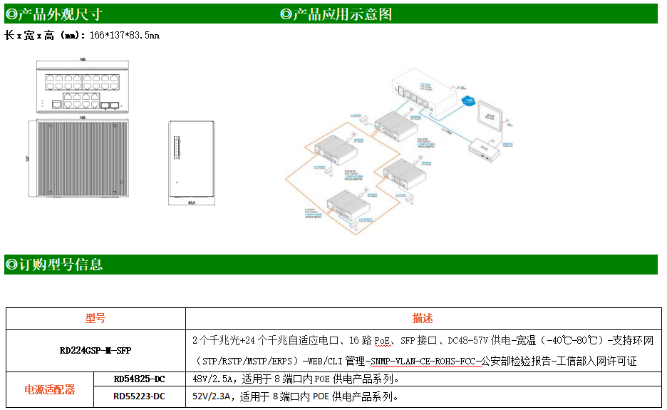 RD224GS-M-SFP是網管型工業以太網交換機,產品符合FCC、CE、RoHS標準。支持2個千兆光口和24個千兆電口,其中16個電口支持PoE供電;支持工業現場所需的以太網二層協議,保證通信網絡的穩定性;該系列交換機采用低功耗、無風扇設計,確保無噪聲干擾,同時支持-40~80℃工作溫度和良好的EMC電磁兼容性能,保證在惡劣的工業環境中保持穩定的工作,為工廠自動化,智能交通,視頻監控等工業應用領域組建快速穩定的網絡終端接入網絡提供安全可靠的解決方案。