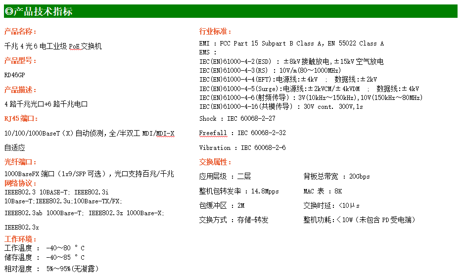 RD46GP系列工業級以太網交換機,提供4個千兆光口+6個千兆電口,支持4路PoE,產品符合FCC、CE、ROHS標準,支持工業現場所需的以太網協議,保證通信網絡的穩定性。該系列交換機采用低功耗、無風扇設計,確保無噪聲干擾,同時支持-40~80℃工作溫度和良好的EMC電磁兼容性能,保證在惡劣的工業環境中保持穩定的工作,為工廠自動化,智能交通,視頻監控等工業應用領域組建快速穩定的網絡終端接入網絡提供安全可靠的解決方案。