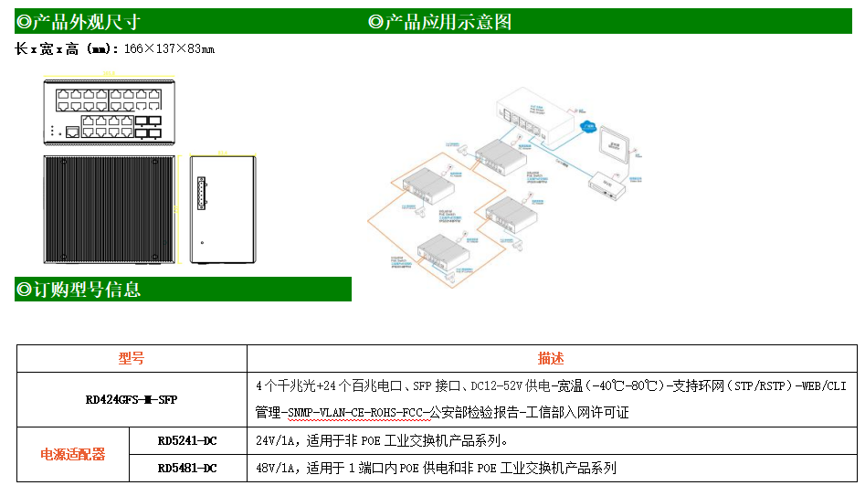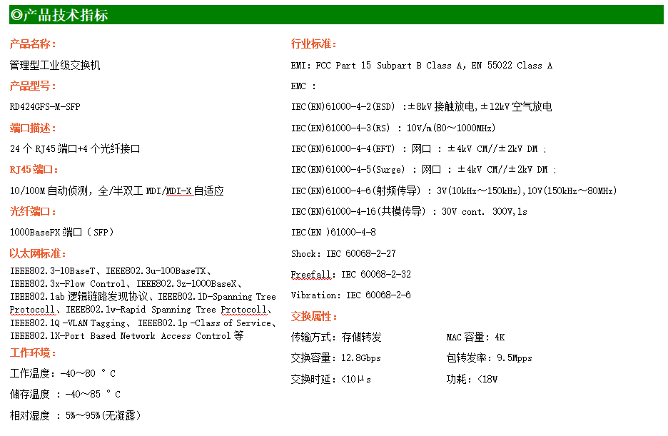 RD424GFS-M是網(wǎng)管型工業(yè)以太網(wǎng)交換機,產(chǎn)品符合FCC、CE、RoHS標(biāo)準(zhǔn)。支持2個千兆光口和24個百兆電口;支持工業(yè)現(xiàn)場所需的以太網(wǎng)二層協(xié)議,保證通信網(wǎng)絡(luò)的穩(wěn)定性;該系列交換機采用低功耗、無風(fēng)扇設(shè)計,確保無噪聲干擾,同時支持-40~80℃工作溫度和良好的EMC電磁兼容性能,保證在惡劣的工業(yè)環(huán)境中保持穩(wěn)定的工作,為工廠自動化,智能交通,視頻監(jiān)控等工業(yè)應(yīng)用領(lǐng)域組建快速穩(wěn)定的網(wǎng)絡(luò)終端接入網(wǎng)絡(luò)提供安全可靠的解決方案。