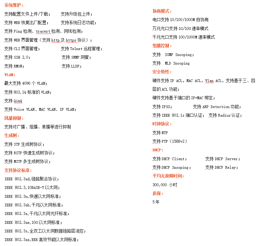 ●網(wǎng)絡(luò)冗余:支持STP/RSTP/MSTP,支持ERPS(自愈時(shí)間<20ms)