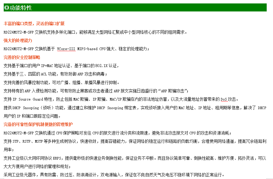 ●網(wǎng)絡(luò)冗余:支持STP/RSTP/MSTP,支持ERPS(自愈時間<20ms)