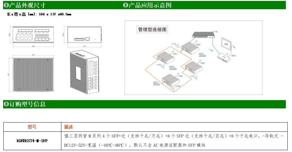 RD88GST4-M-SFP交換機是我司推出的一款萬兆三層交換機,配備4個萬兆SFP+光口、8個千兆SFP光口和8個10/100/1000M Base-T自適應電口,具備先進的硬件處理能力和最豐富的業(yè)務特性。支持IPv4/IPv6 硬件雙棧及線速轉(zhuǎn)發(fā),使客戶能夠從容應對即將帶來的IPv6 時代其提供高容量的交換能力。RD88GST4-M-SFP交換機具有-40℃~80℃的工作溫度,具有超強的堅固度能適應各種嚴苛環(huán)境。導軌式安裝特性、寬溫操作,使RD48GST4-M-SFP的交換機成為一個即插即用的工業(yè)級設備,為用戶的以太網(wǎng)設備聯(lián)網(wǎng)提供可靠、便捷的解決方案。