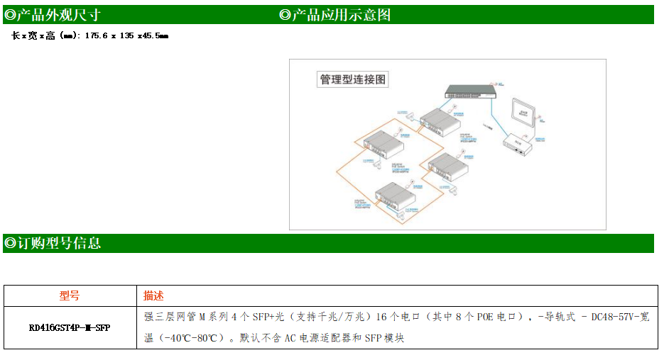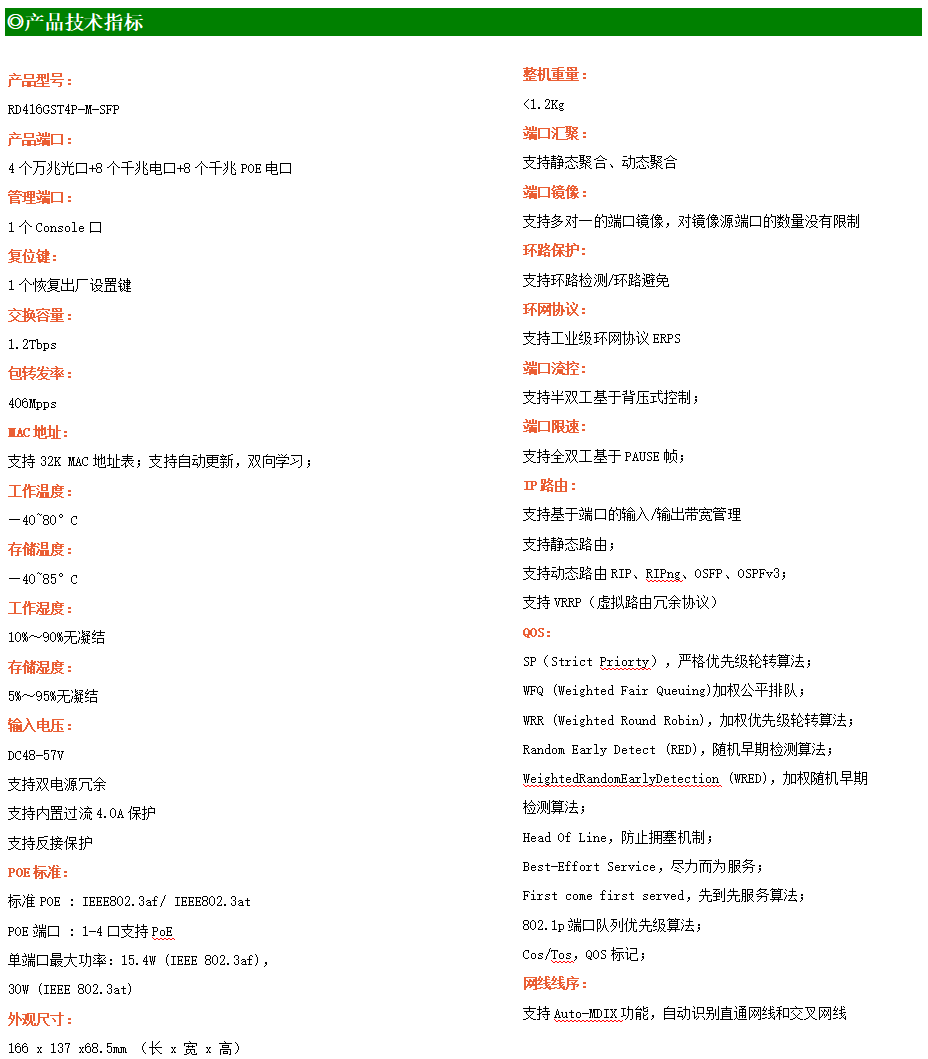 RD416GST4P-M-SFP交換機是我司推出的一款萬兆三層POE交換機,配備4個萬兆SFP+光口+8個10/100/1000M Base-T自適應電口+8個10/100/1000M Base-T自適應POE電口,具備先進的硬件處理能力和最豐富的業務特性。支持IPv4/IPv6 硬件雙棧及線速轉發,使客戶能夠從容應對即將帶來的IPv6 時代其提供高容量的交換能力。RD416GST4P-M-SFP交換機具有-40℃~80℃的工作溫度,具有超強的堅固度能適應各種嚴苛環境。導軌式安裝特性、寬溫操作,使RD416GST4P-M-SFP的交換機成為一個即插即用的工業級設備,為用戶的以太網設備聯網提供可靠、便捷的解決方案。