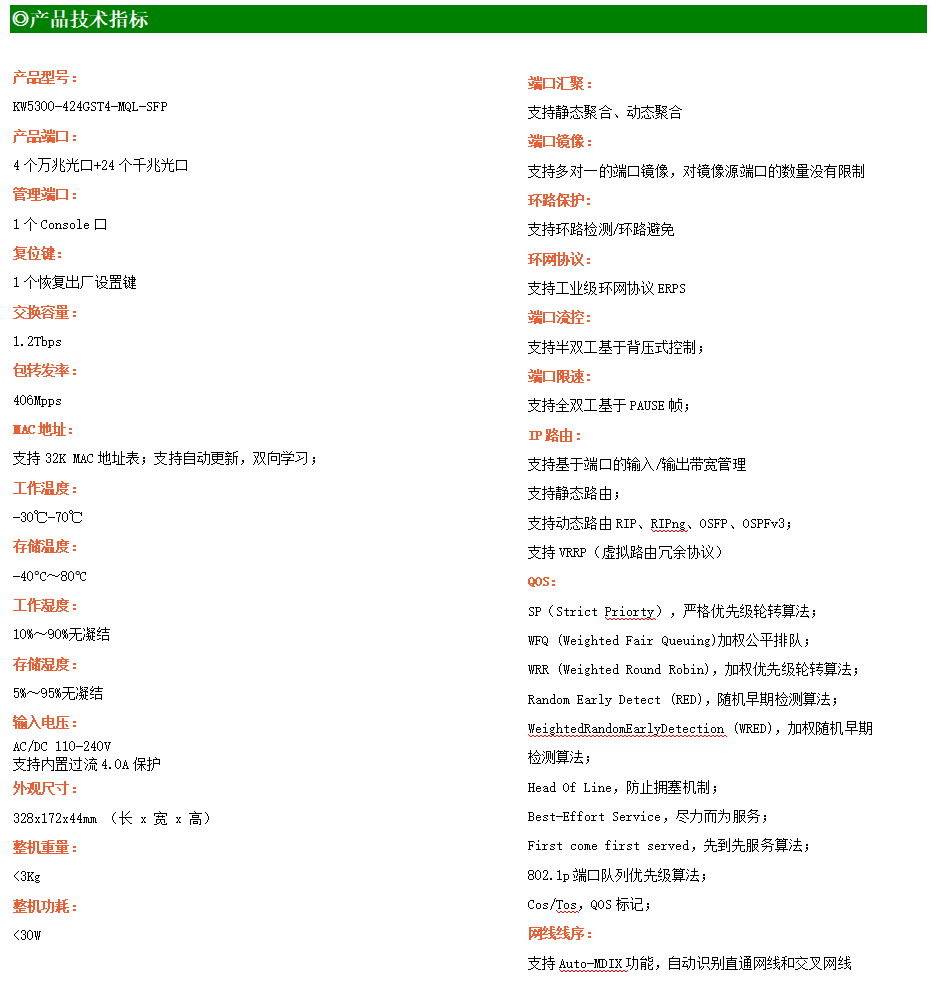 KW5300-424GST4-MQL-SFP交換機是我司推出的一款萬兆三層交換機,配備4個萬兆SFP+光口和24個千兆光口,具備先進的硬件處理能力和最豐富的業務特性。支持IPv4/IPv6 硬件雙棧及線速轉發,使客戶能夠從容應對即將帶來的IPv6 時代其提供高容量的交換能力。KW5300-424GST4-MQL-SFP交換機具有-30℃-70℃的工作溫度,具有超強的堅固度能適應各種嚴苛環境。導軌式安裝特性、寬溫操作,使KW5300-424GST4-MQL-SFP的交換機成為一個即插即用的工業級設備,為用戶的以太網設備聯網提供可靠、便捷的解決方案。