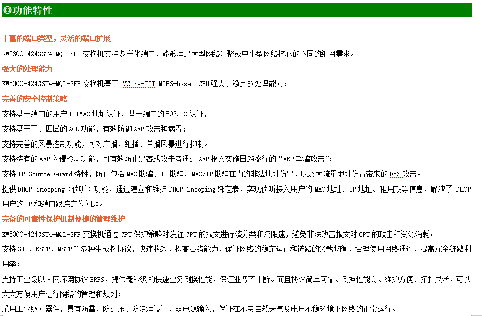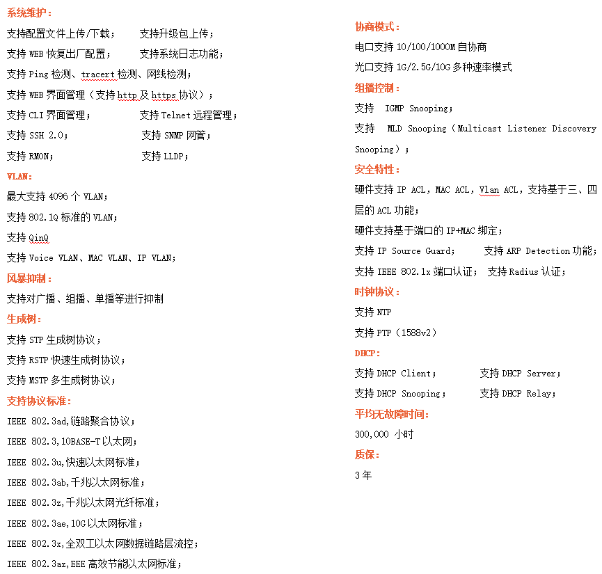 ●網絡冗余:支持STP/RSTP/MSTP,支持ERPS(自愈時間<20ms)