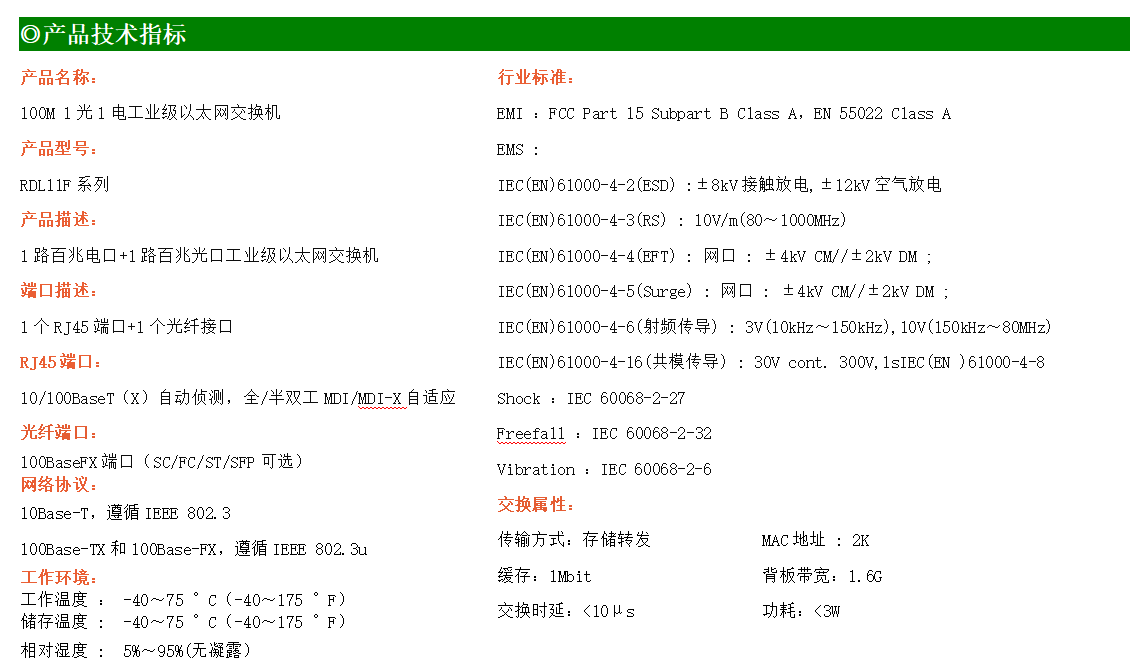 1路百兆電口+1路百兆FX光口工業級以太網交換機,支持1個10Base-T/100Base-TX電口和1個100Base-X光口。產品符合FCC、CE、ROHS標準。RDL11F系列交換機具有-40℃~75℃的工作溫度,具有超強的堅固度能適應各種嚴苛環境,也可以非常方便的安置在空間緊湊的控制箱中。導軌的安裝特性、寬溫操作及擁有IP40防護等級的外殼及LED指示燈,使RDL11F成為一個即插即用的工業級設備,為用戶的以太網設備聯網提供可靠、便捷的解決方案。