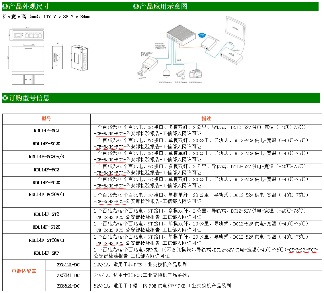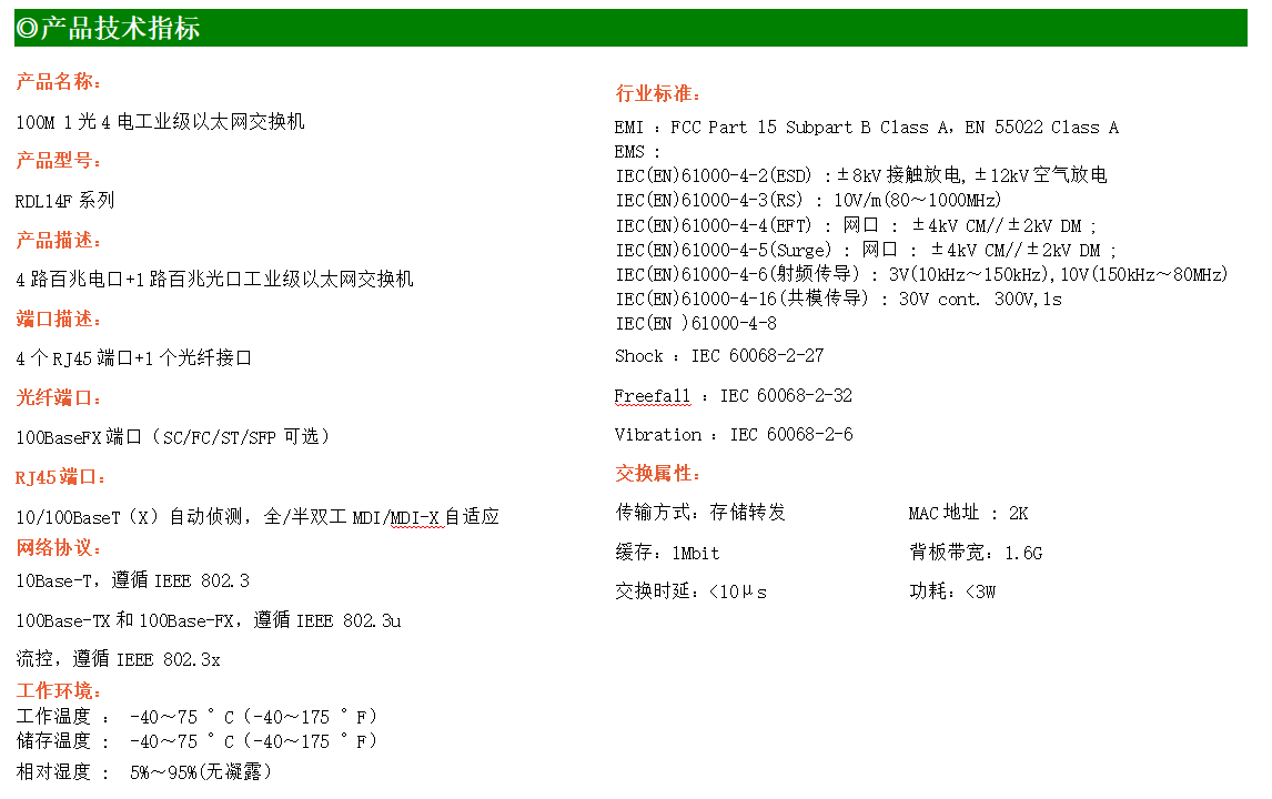 4路百兆電口+1路百兆FX光口工業(yè)級以太網(wǎng)交換機(jī),支持4個10Base-T/100Base-TX電口和1個100Base-X光口。產(chǎn)品符合FCC、CE、ROHS標(biāo)準(zhǔn)。RDL14F系列交換機(jī)具有-40℃~75℃的工作溫度,具有超強(qiáng)的堅固度能適應(yīng)各種嚴(yán)苛環(huán)境,也可以非常方便的安置在空間緊湊的控制箱中。導(dǎo)軌的安裝特性、寬溫操作及擁有IP40防護(hù)等級的外殼及LED指示燈,使RDL14F成為一個即插即用的工業(yè)級設(shè)備,為用戶的以太網(wǎng)設(shè)備聯(lián)網(wǎng)提供可靠、便捷的解決方案。
