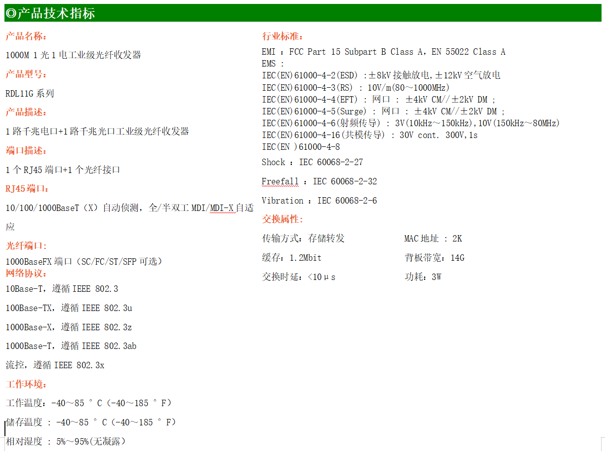 1路千兆電口+1路千兆FX光口工業級以太網交換機,支持1個10Base-T/100Base-T/1000Base-TX電口和1個1000Base-X光口。產品符合FCC、CE、ROHS標準。RDL11G系列交換機具有-40℃~75℃的工作溫度,具有超強的堅固度能適應各種嚴苛環境,也可以非常方便的安置在空間緊湊的控制箱中。導軌的安裝特性、寬溫操作及擁有IP40防護等級的外殼及LED指示燈,使RDL11G成為一個即插即用的工業級設備,為用戶的以太網設備聯網提供可靠、便捷的解決方案。