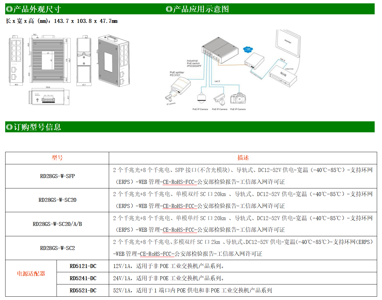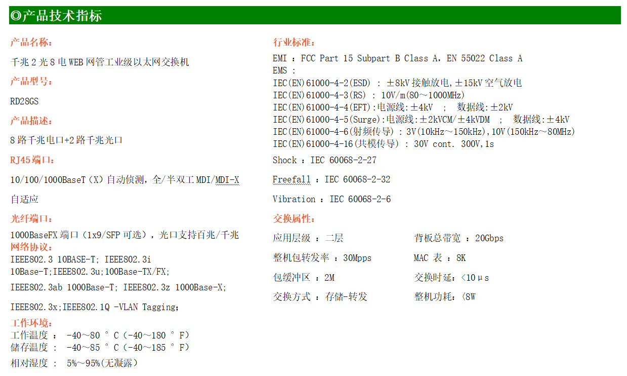 RD28GS-W-SFP系列WEB網(wǎng)管工業(yè)級(jí)以太網(wǎng)交換機(jī),產(chǎn)品符合FCC、CE、ROHS標(biāo)準(zhǔn),支持工業(yè)現(xiàn)場(chǎng)所需的以太網(wǎng)二層協(xié)議,保證通信網(wǎng)絡(luò)的穩(wěn)定性。該系列交換機(jī)采用低功耗、無(wú)風(fēng)扇設(shè)計(jì),確保無(wú)噪聲干擾,同時(shí)支持-40~85℃工作溫度和良好的EMC電磁兼容性能,保證在惡劣的工業(yè)環(huán)境中保持穩(wěn)定的工作,為工廠自動(dòng)化,智能交通,視頻監(jiān)控等工業(yè)應(yīng)用領(lǐng)域組建快速穩(wěn)定的網(wǎng)絡(luò)終端接入網(wǎng)絡(luò)提供安全可靠的解決方案。